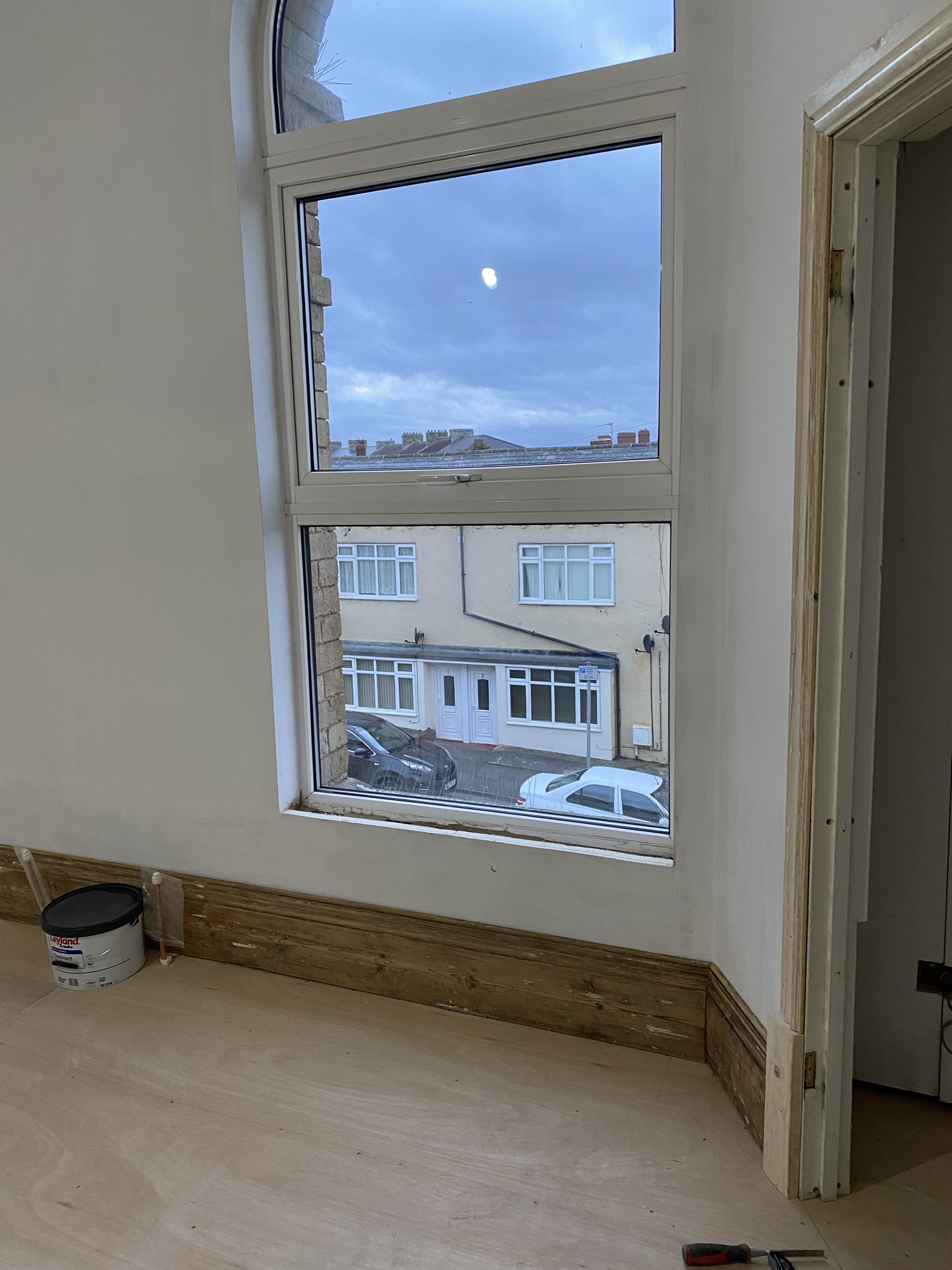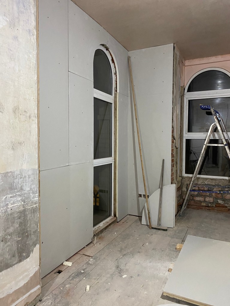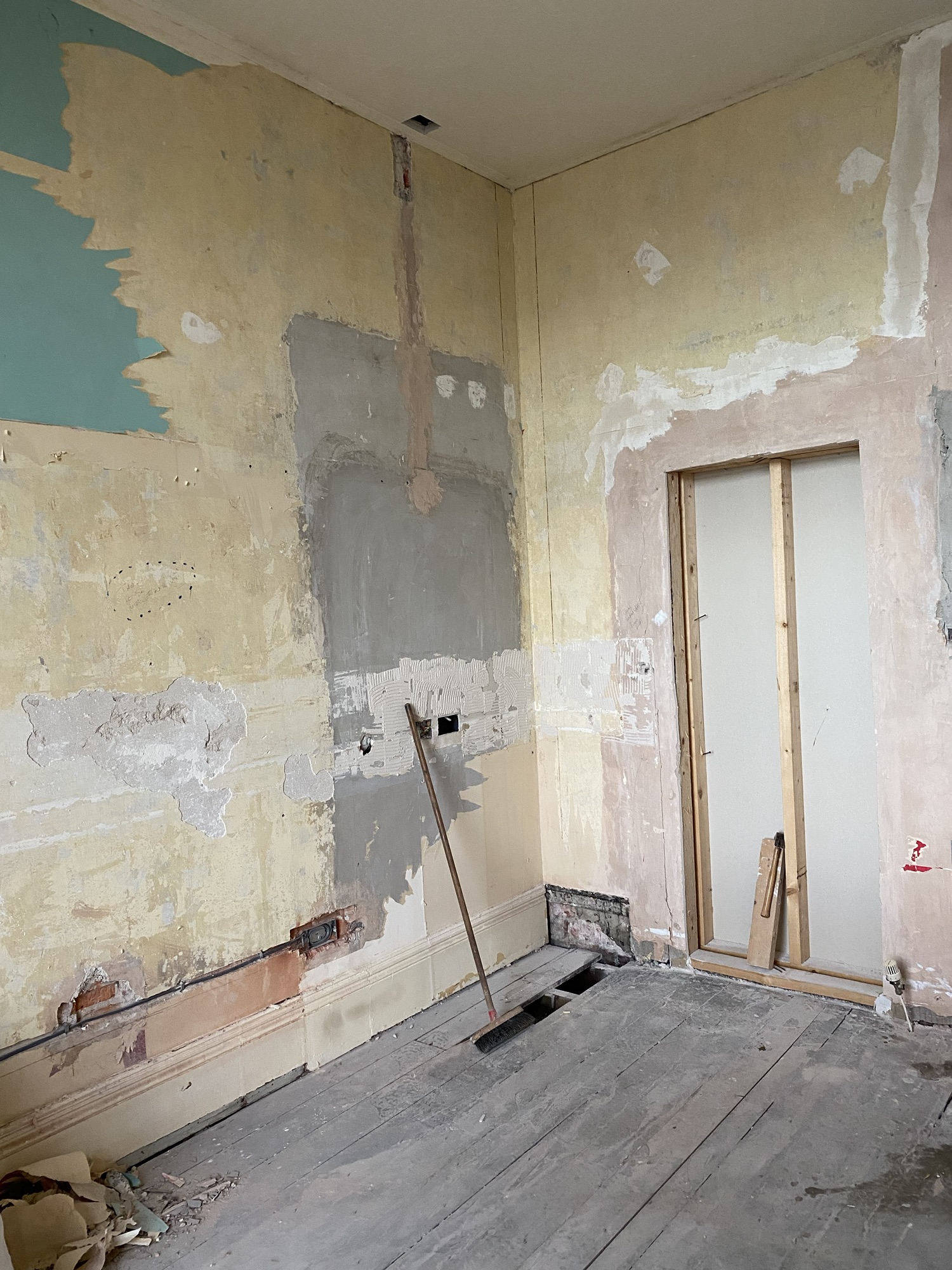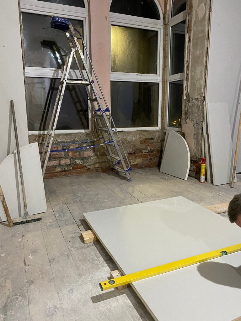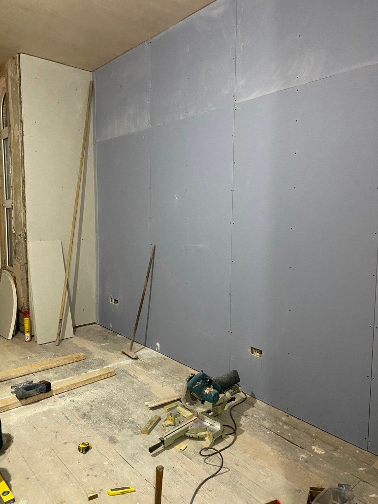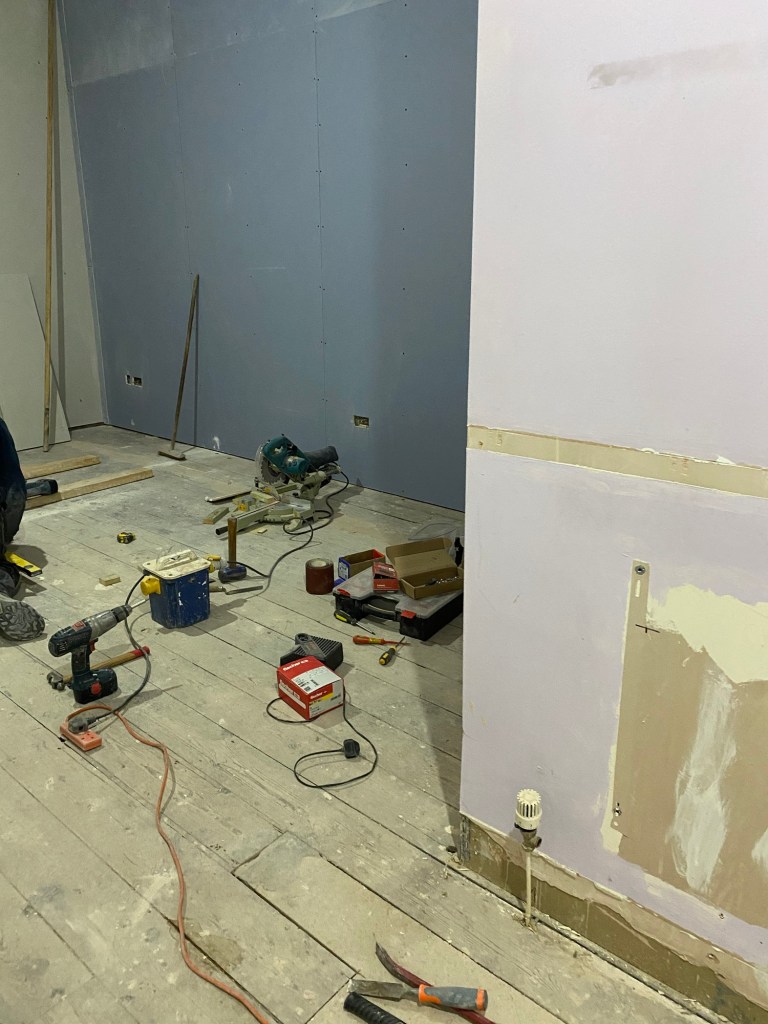 The rest of the room will be worked on today. Tiles are now removed, though a lot just fell off as soon as you touched them. All walls and ceiling will be boarded for a smooth insulated finish ready for plastering. We will complete taking out two doorways to make one large room.