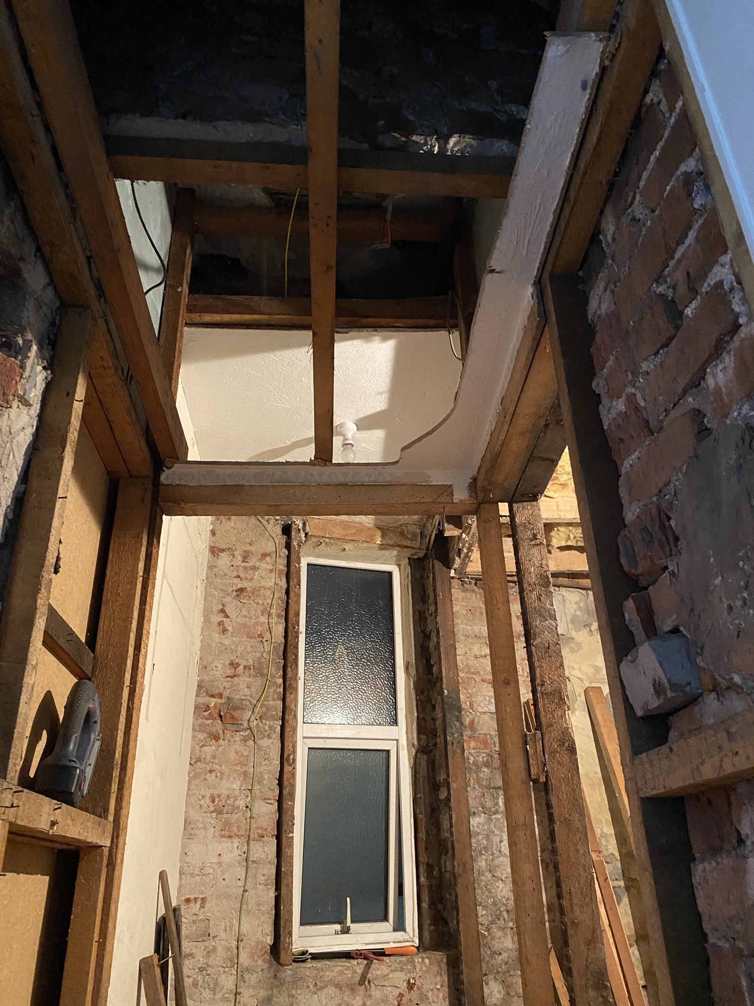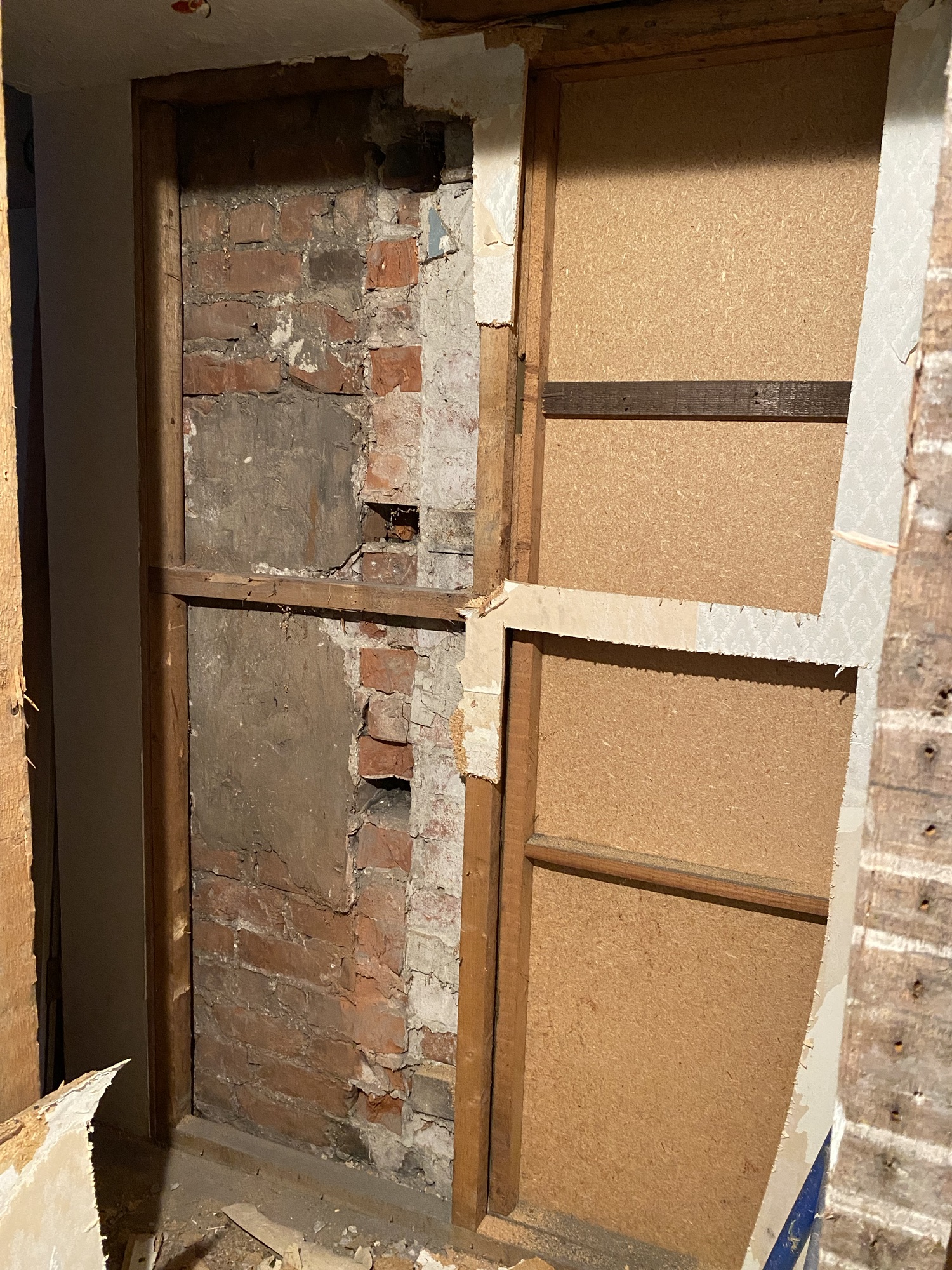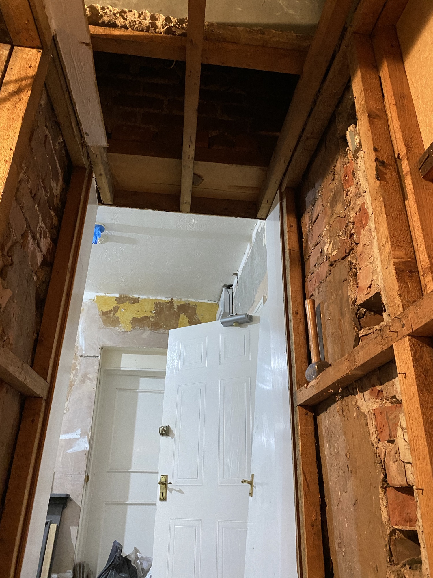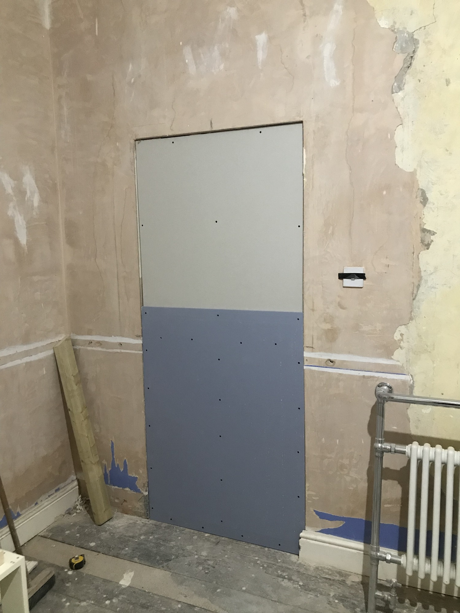 On our journey preparing the utility room we found yet another vast space in the ceiling! I’m not sure what it was for, it’s not a chimney as the brickwork is too clean. It is vast and we can’t see the top. Previous builders have cut through the brickwork to make a doorway into the space which when we bought it was a full bathroom. We have uncovered an old doorway which would have led straight onto the stairwell. This was blocked up using chipboard! Big fire hazard which had the potential to block the stairwell. So this will now be blocked correctly with pink plasterboard which is used to slow down any potential fire. They are usually used on ceilings in flats or you can double up ordinary plasterboard to achieve the same.