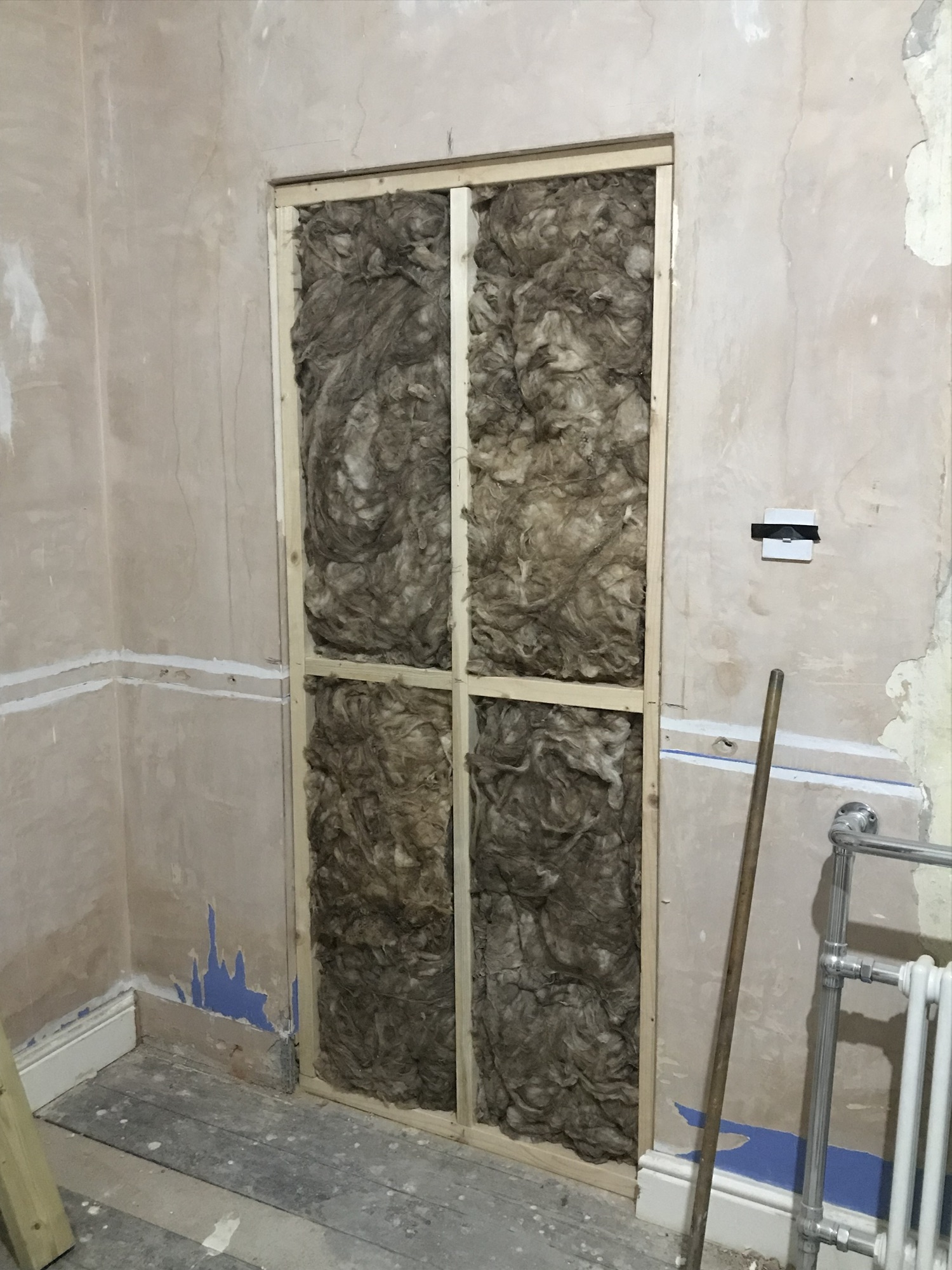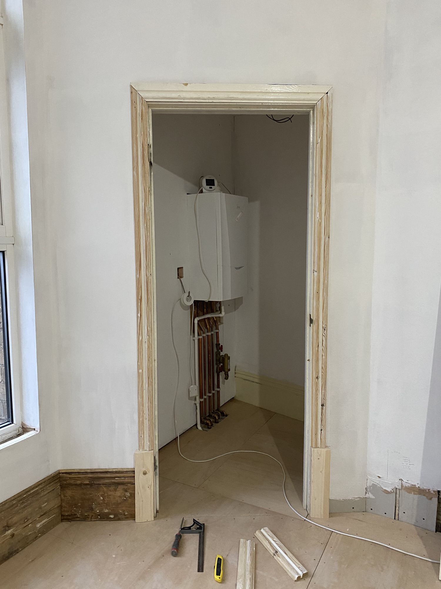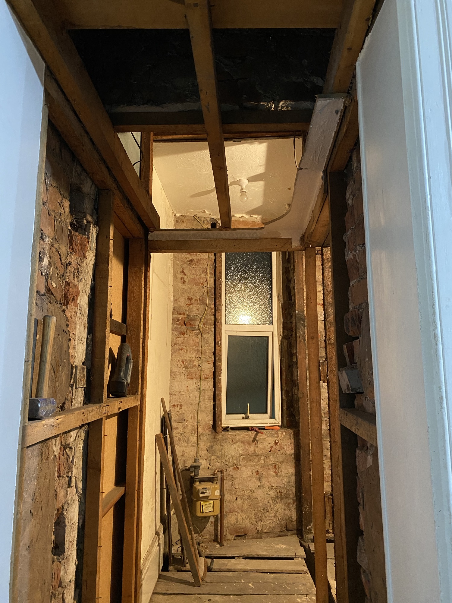 On our journey preparing the utility room we found yet another vast space in the ceiling! I’m not sure what it was for, it’s not a chimney as the brickwork is too clean. It is vast and we can’t see the top. Previous builders have cut through the brickwork to make a doorway into the space which when we bought it was a full bathroom. We have uncovered an old doorway which would have led straight onto the stairwell. This was blocked up using chipboard! Big fire hazard which had the potential to block the stairwell. So this will now be blocked correctly with pink plasterboard which is used to slow down any potential fire. They are usually used on ceilings in flats or you can double up ordinary plasterboard to achieve the same.