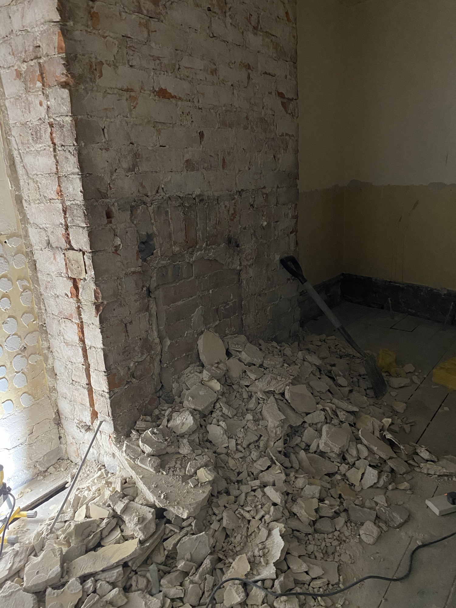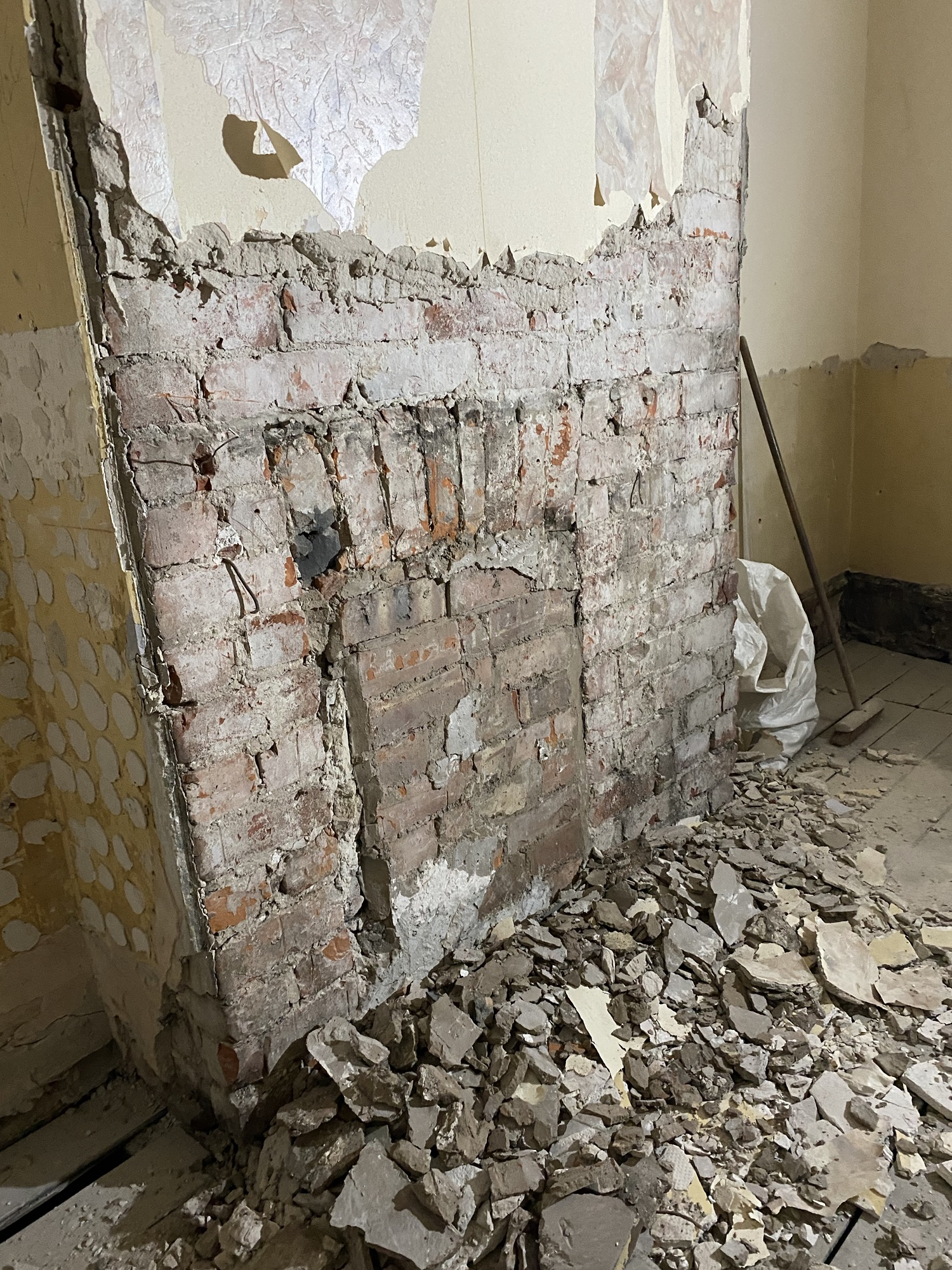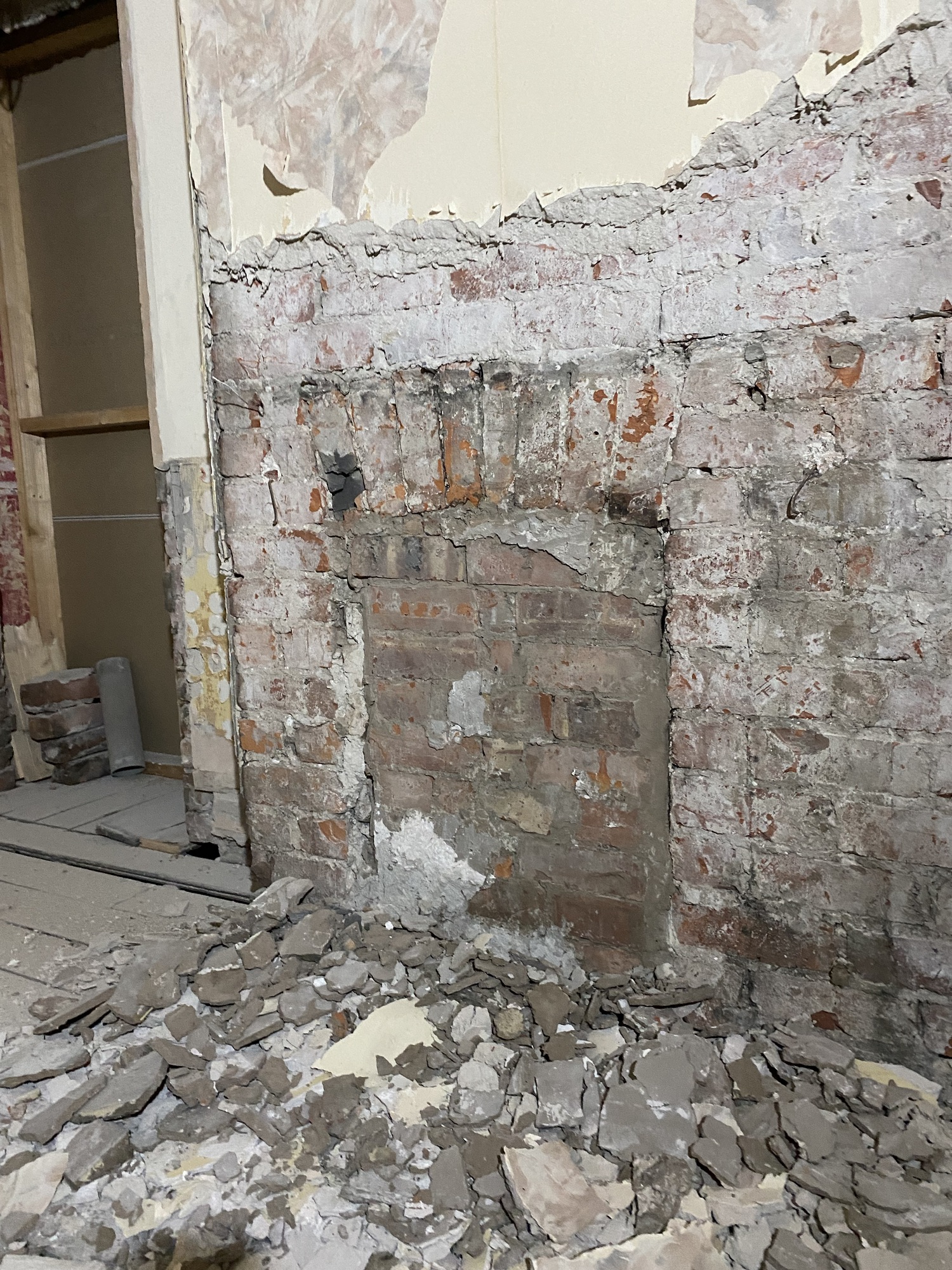 I could see a chimney breast in the room, the lower half covered in wooden slats, the rest in vinyl wallpaper. Wood removed and using a hammer drill I started removing all of the old plaster from this area. I started to expose the original brick and came across the fireplace (bricked up). Very pretty I think. In the floor is the original hearth and wooden edging. The fire is offset (not in the centre of the fire breast). I’m not entirely sure why, perhaps it’s the way the chimney stack is built and it goes up on an angle?