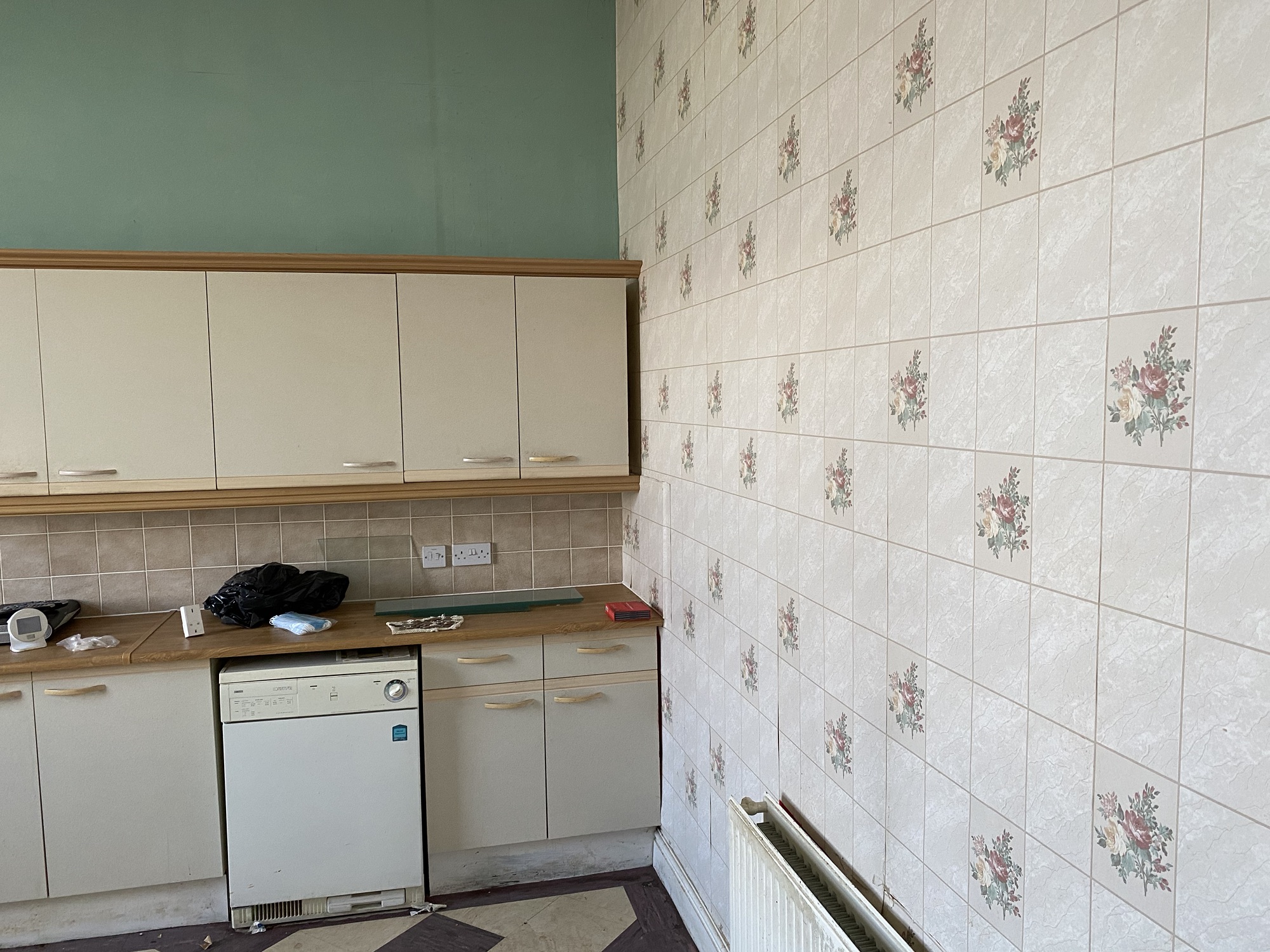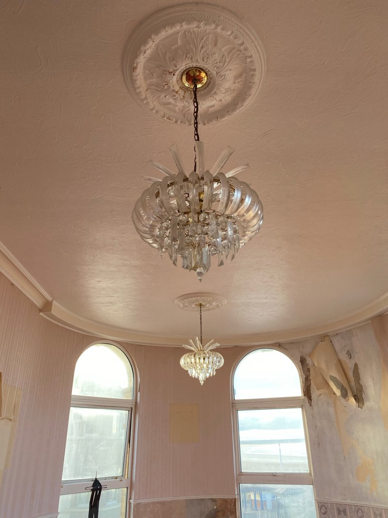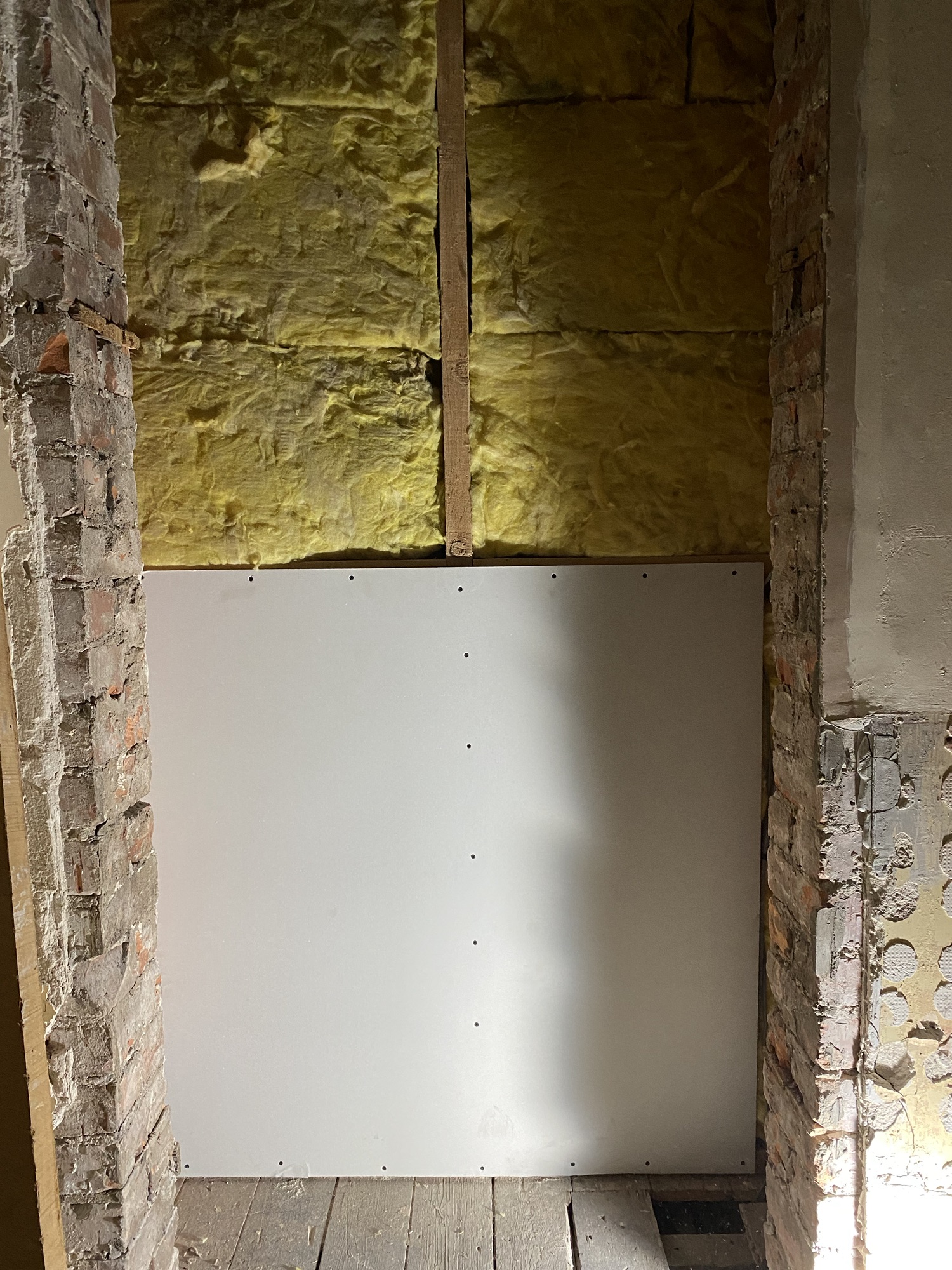 I could see a chimney breast in the room, the lower half covered in wooden slats, the rest in vinyl wallpaper. Wood removed and using a hammer drill I started removing all of the old plaster from this area. I started to expose the original brick and came across the fireplace (bricked up). Very pretty I think. In the floor is the original hearth and wooden edging. The fire is offset (not in the centre of the fire breast). I’m not entirely sure why, perhaps it’s the way the chimney stack is built and it goes up on an angle?